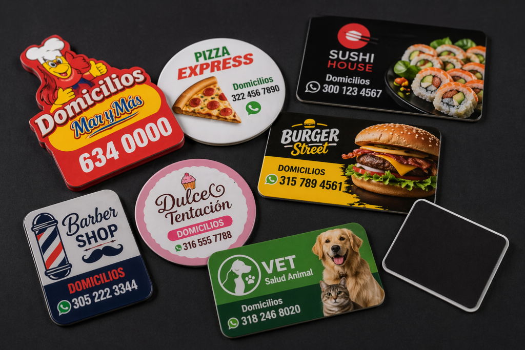 Mantén tu marca siempre visible con imanes publicitarios personalizados, ideales para negocios de domicilios, restaurantes y servicios.